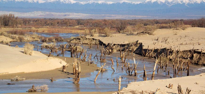 One of the most striking features visible from the lake is the Aktau Mountains (White Mountains) on the opposite bank of the Ili River. These mountains are visible from the tops of the lake’s sand dunes and are located within the territory of the state National Natural Park “Altyn-Emel”. The contrast between the mountains, desert, and water creates a photographer’s paradise.